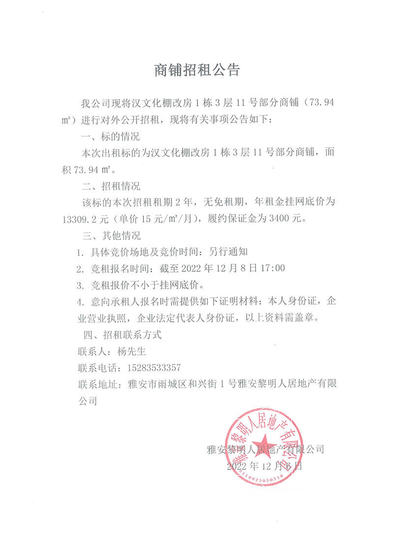 漢文化棚改房1棟3層11號(hào)部分商鋪招租公告