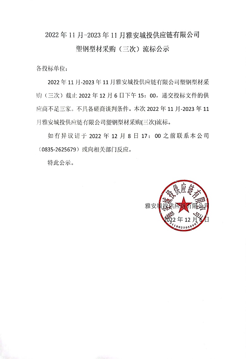 2022年11月-2023年11月雅安城投供應(yīng)鏈有限公司塑鋼型材采購(三次)流標(biāo)公示