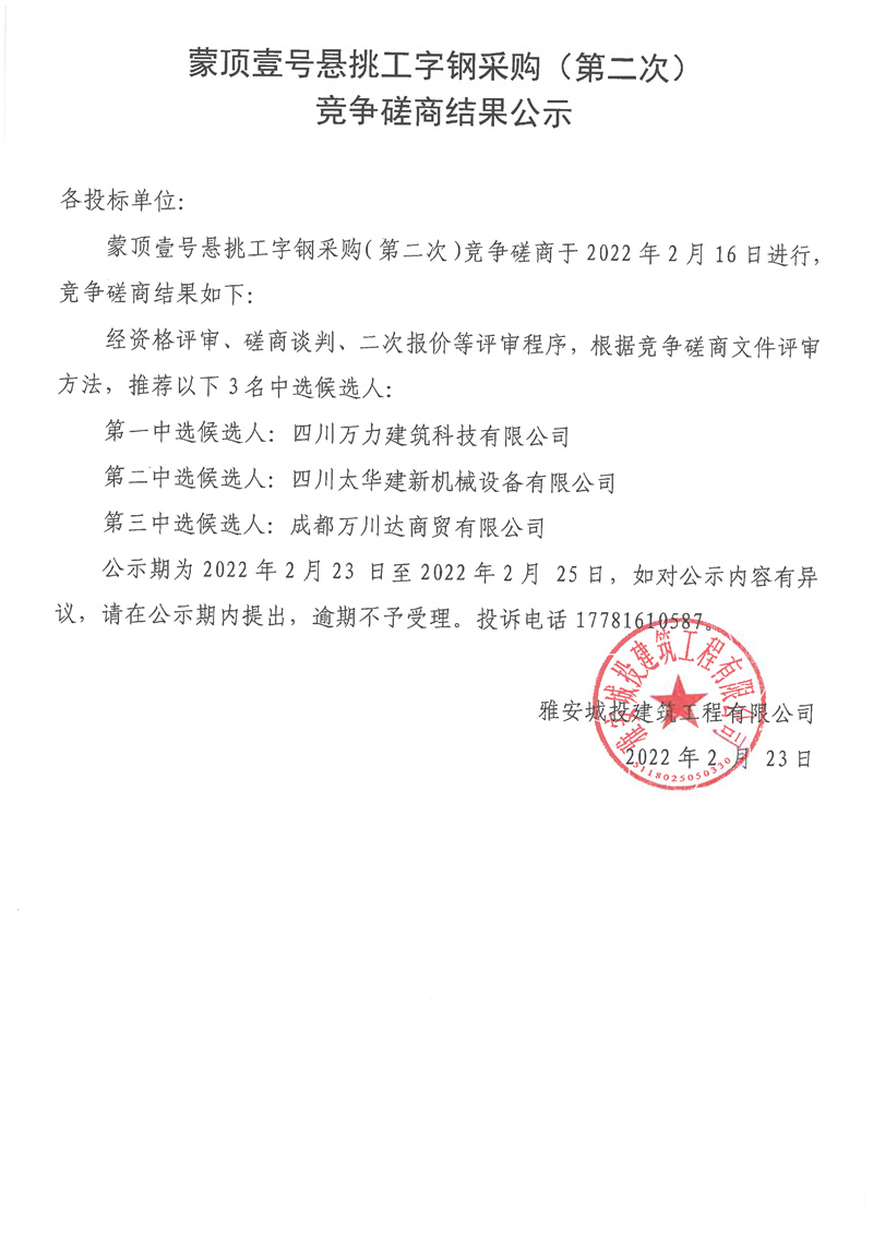 蒙頂壹號(hào)懸挑工字鋼采購(gòu)(第二次)競(jìng)爭(zhēng)磋商結(jié)果公示