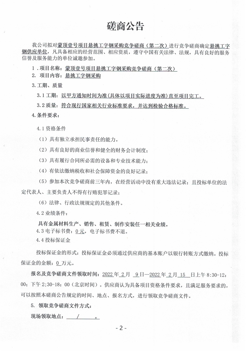 蒙頂壹號(hào)項(xiàng)目懸挑工字鋼采購(gòu)競(jìng)爭(zhēng)磋商公告(第二次)