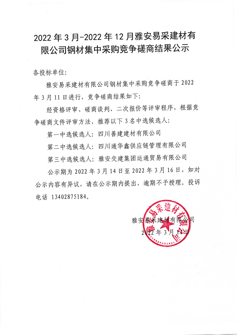 2022年3月-2022年12月雅安易采建材有限公司鋼材采購競爭磋商結(jié)果公示