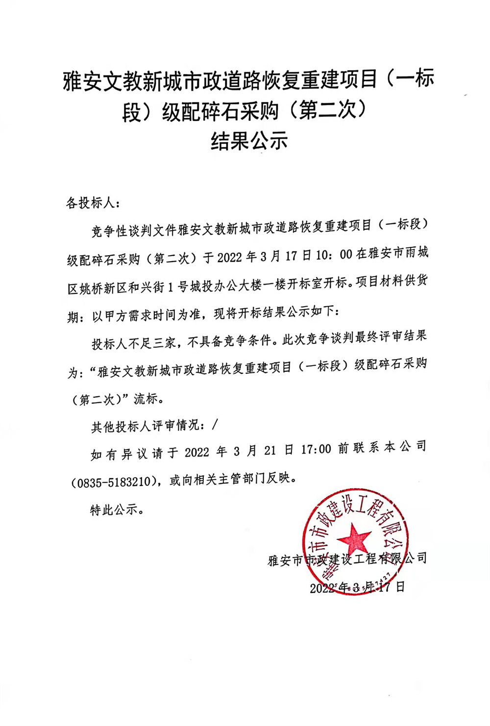 雅安文教新城市政道路恢復(fù)重建項目(一標(biāo)段)級配碎石采購(第二次)結(jié)果公示