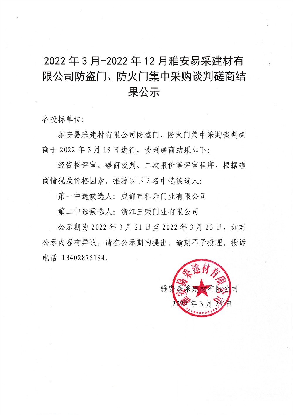 2022年3月-2022年12月雅安易采建材有限公司防盜門(mén)、防火門(mén)等談判磋商結(jié)果公示