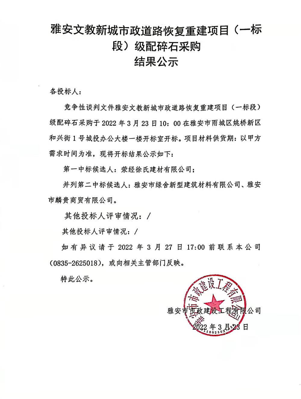 雅安文教新城市政道路恢復(fù)重建項(xiàng)目(一標(biāo)段)級(jí)配碎石采購(gòu)結(jié)果公示