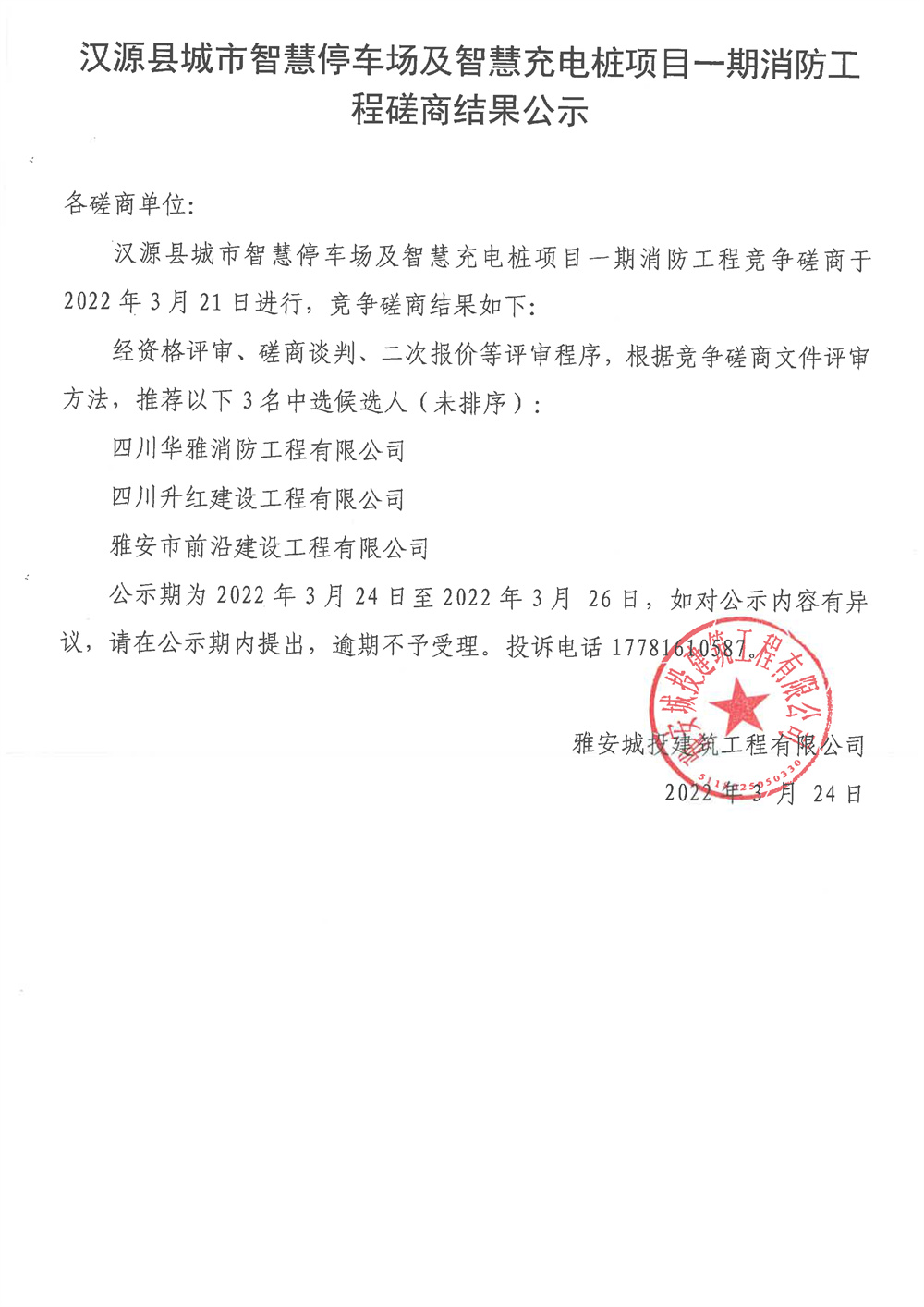 漢源縣城市智慧停車場及智慧充電樁項目一期消防工程磋商結(jié)果公示