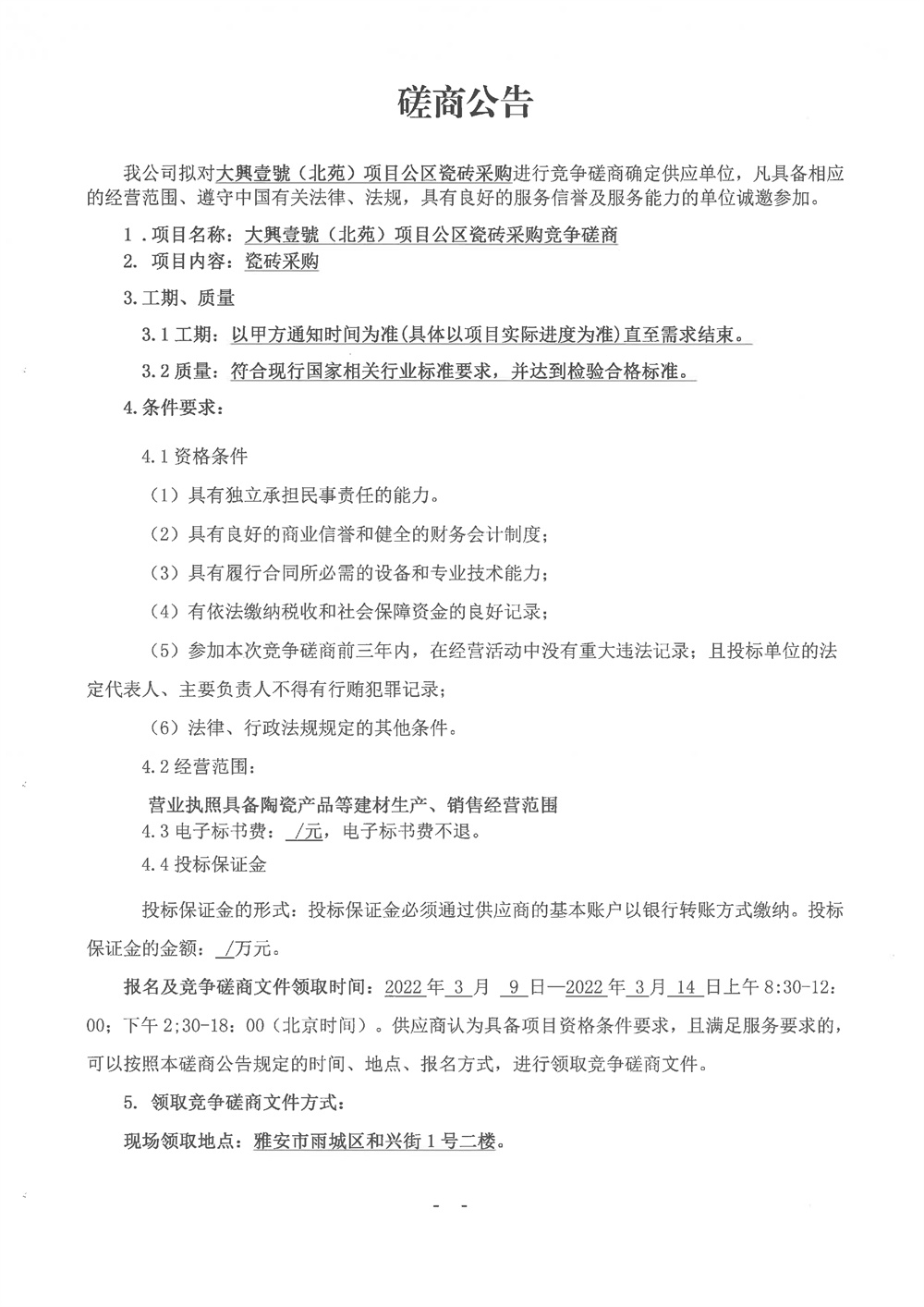 城投建工公司大興壹號(北苑)項目公區(qū)瓷磚采購競爭磋商公告