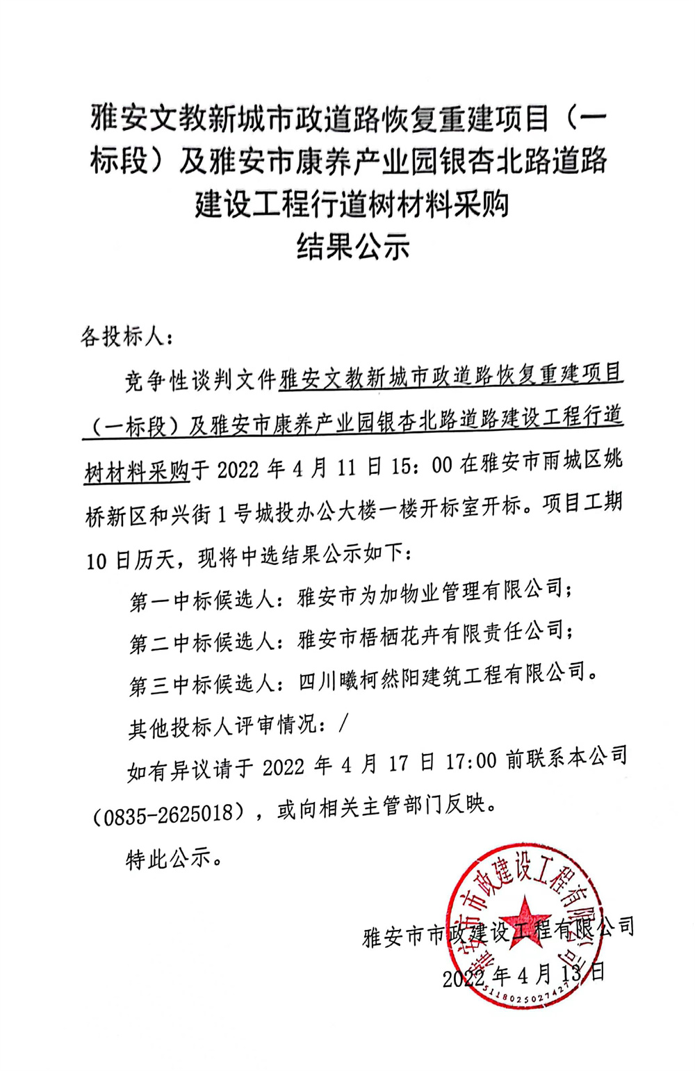 雅安文教新城市政道路恢復(fù)重建項(xiàng)目(一標(biāo)段)及雅安市康養(yǎng)產(chǎn)業(yè)園銀杏北路道路建設(shè)工程行道樹材料采購(gòu)結(jié)果公示