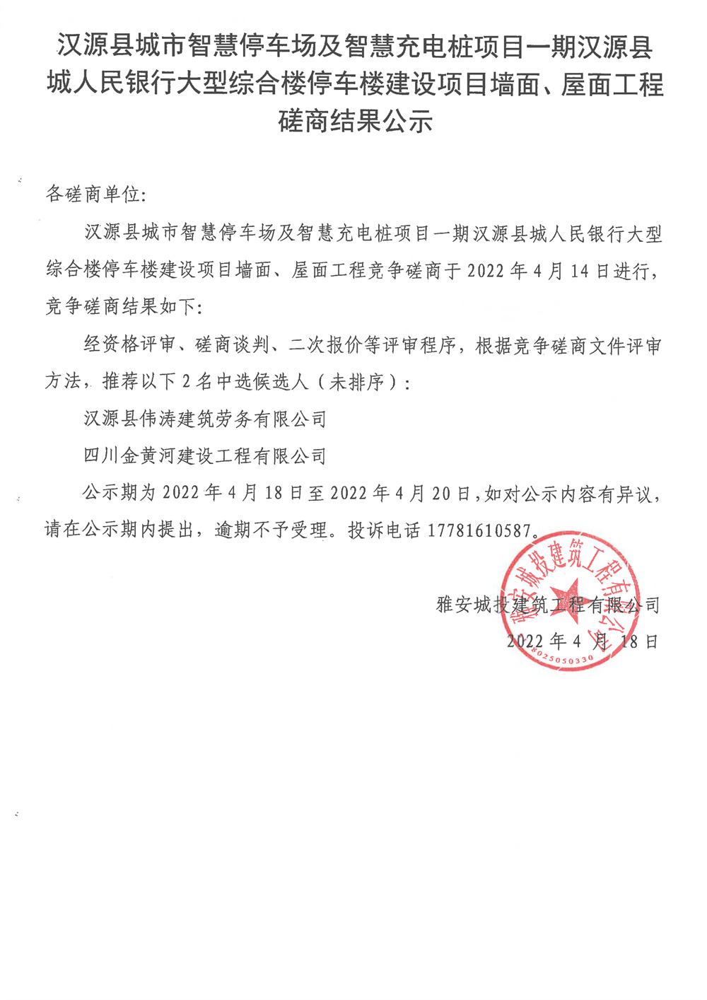 城投建工漢源縣城市智慧停車場及智慧充電樁項目一期漢源縣城人民銀行大型綜合樓停車樓建設項目墻面、屋面工程競爭磋商結果公示