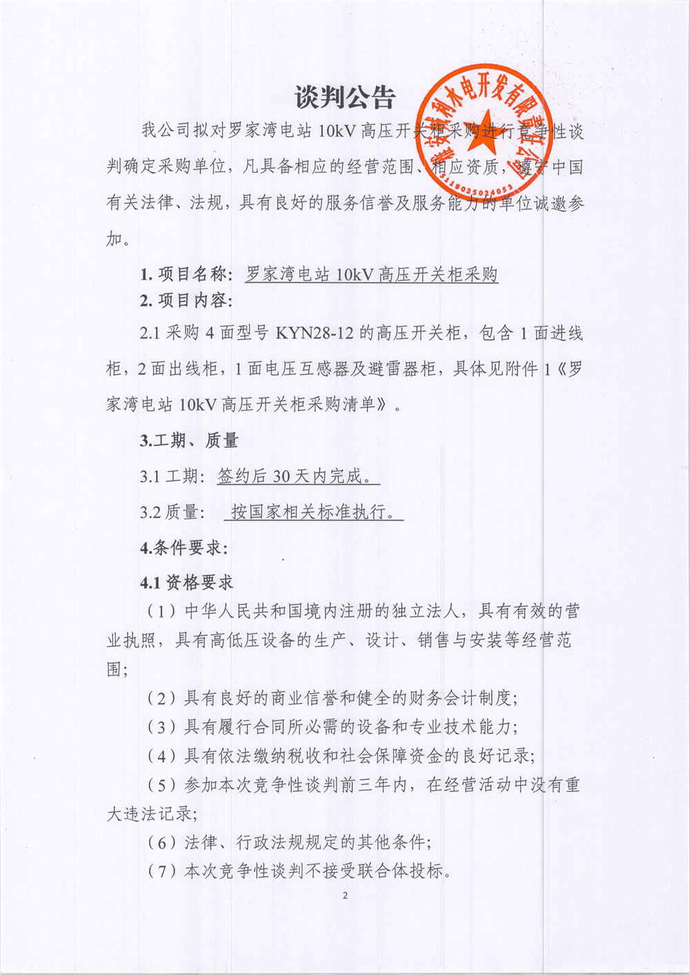 城利水電公司羅家灣電站10KV高壓開關(guān)柜柜采購競爭性談判公告