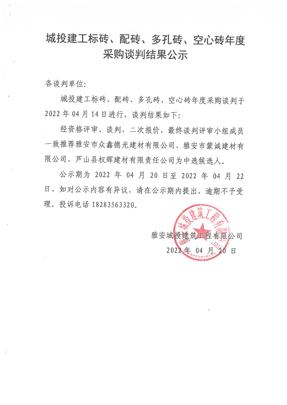 城投建工標(biāo)磚、配磚、多孔磚、空心磚年度采購競爭性談判結(jié)果公示