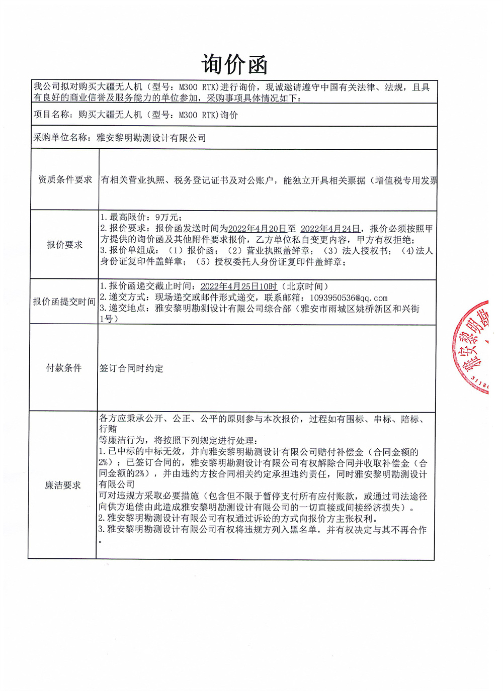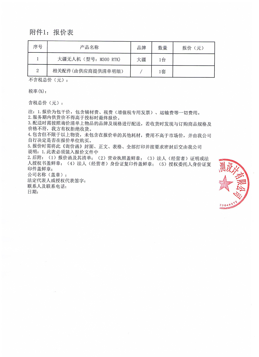 黎明勘測(cè)公司購買大疆無人機(jī)(型號(hào):M300 RTK)詢價(jià)函