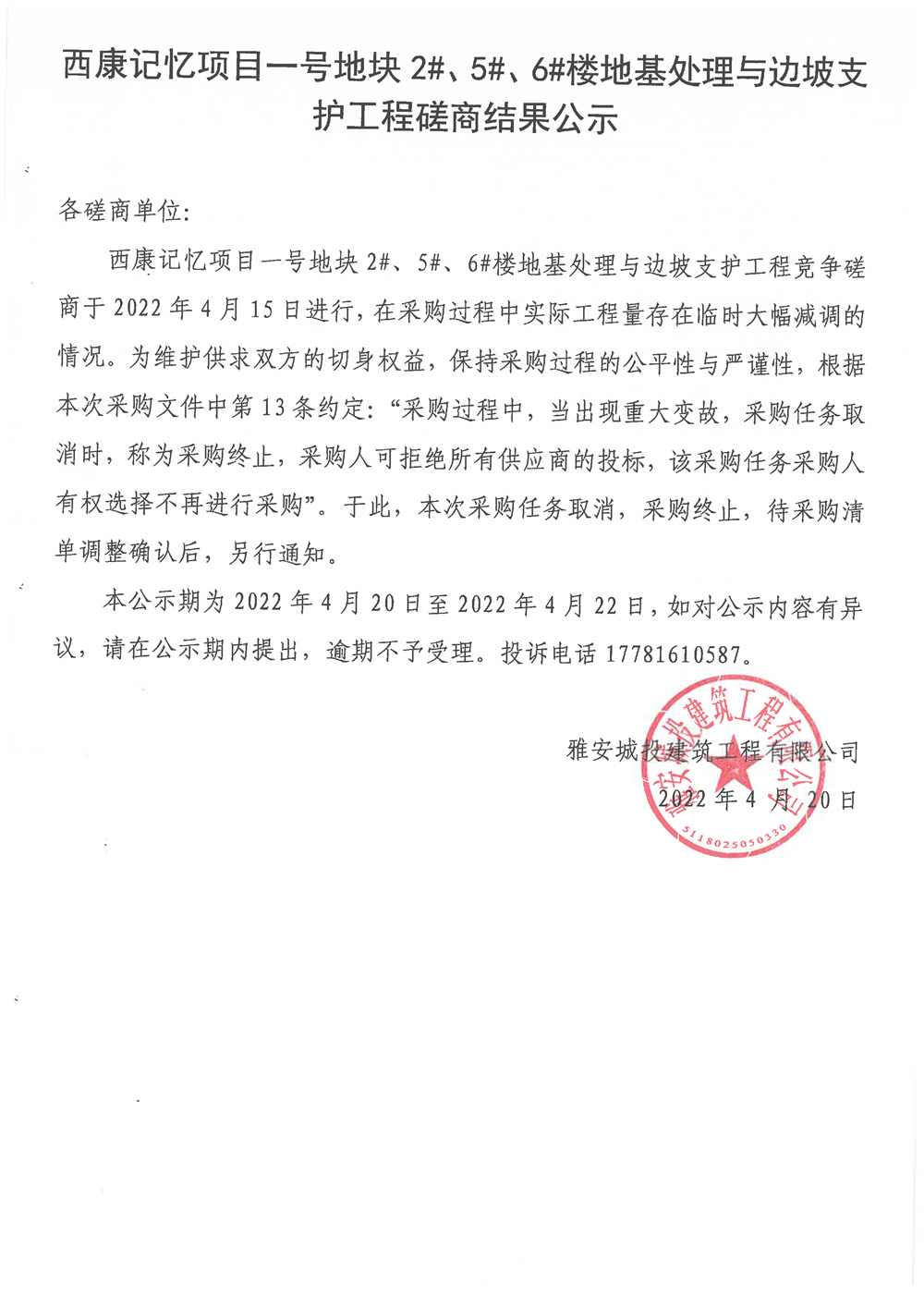 西康記憶項(xiàng)目一號地塊2#、5#、6#樓地基處理與邊坡支護(hù)工程磋商結(jié)果公示