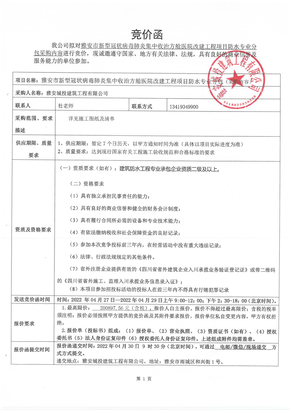雅安市新型冠狀病毒肺炎集中收治方艙醫(yī)院改建工程項(xiàng)目防水專業(yè)分包采購