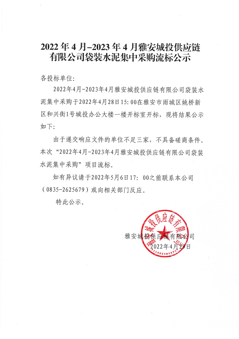 2022年4月-2023年4月雅安城投供應鏈有限公司袋裝水泥集中采購流標公示