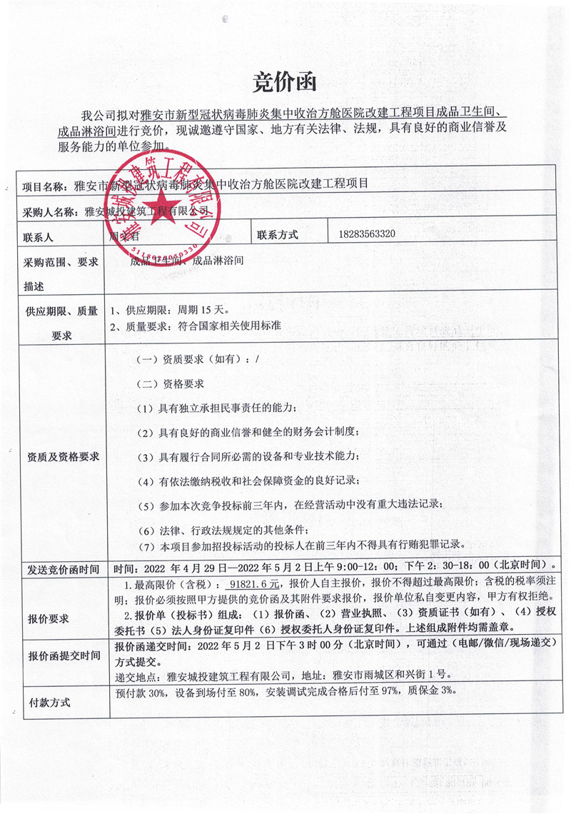 雅安市新型冠狀病毒肺炎集中收治方艙醫(yī)院改建工程項目成品衛(wèi)生間、淋浴間競價函