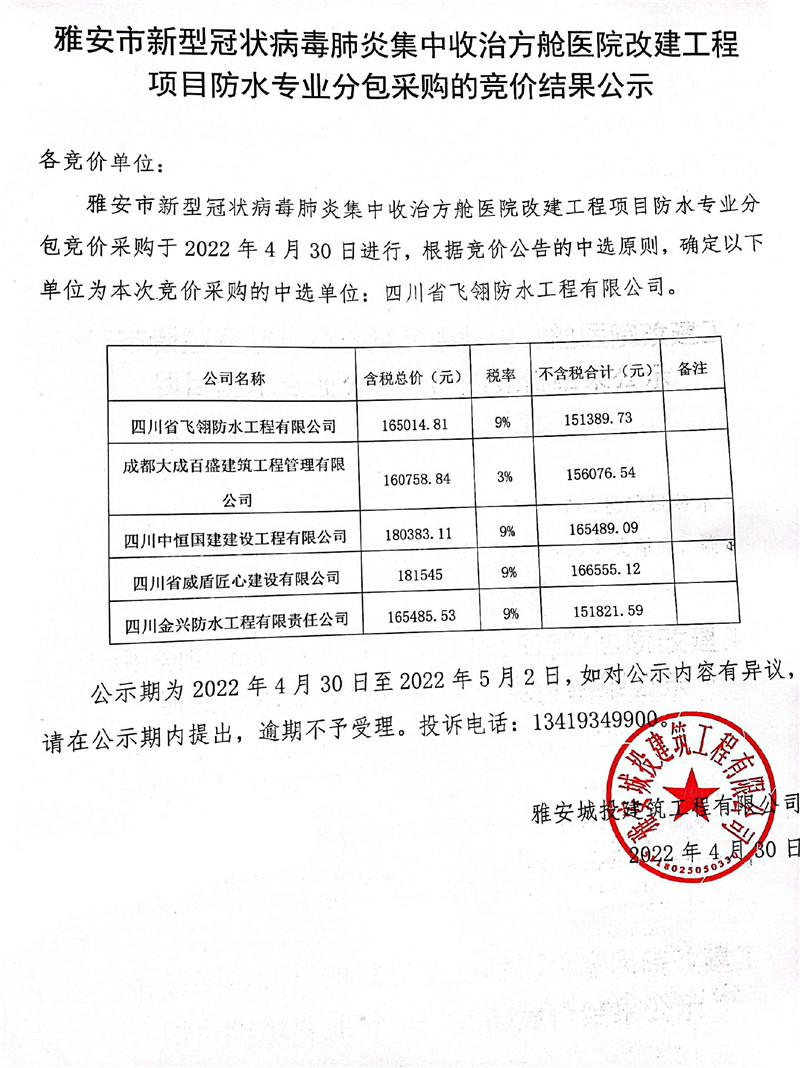 雅安市新型冠狀病毒肺炎集中收治方艙醫(yī)院改建工程項(xiàng)目防水專業(yè)分包采購的競價(jià)結(jié)果公示