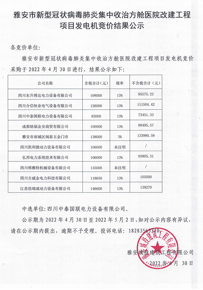雅安市新型冠狀病毒肺炎集中收治方艙醫(yī)院改建工程項(xiàng)目發(fā)電機(jī)競(jìng)價(jià)結(jié)果公示