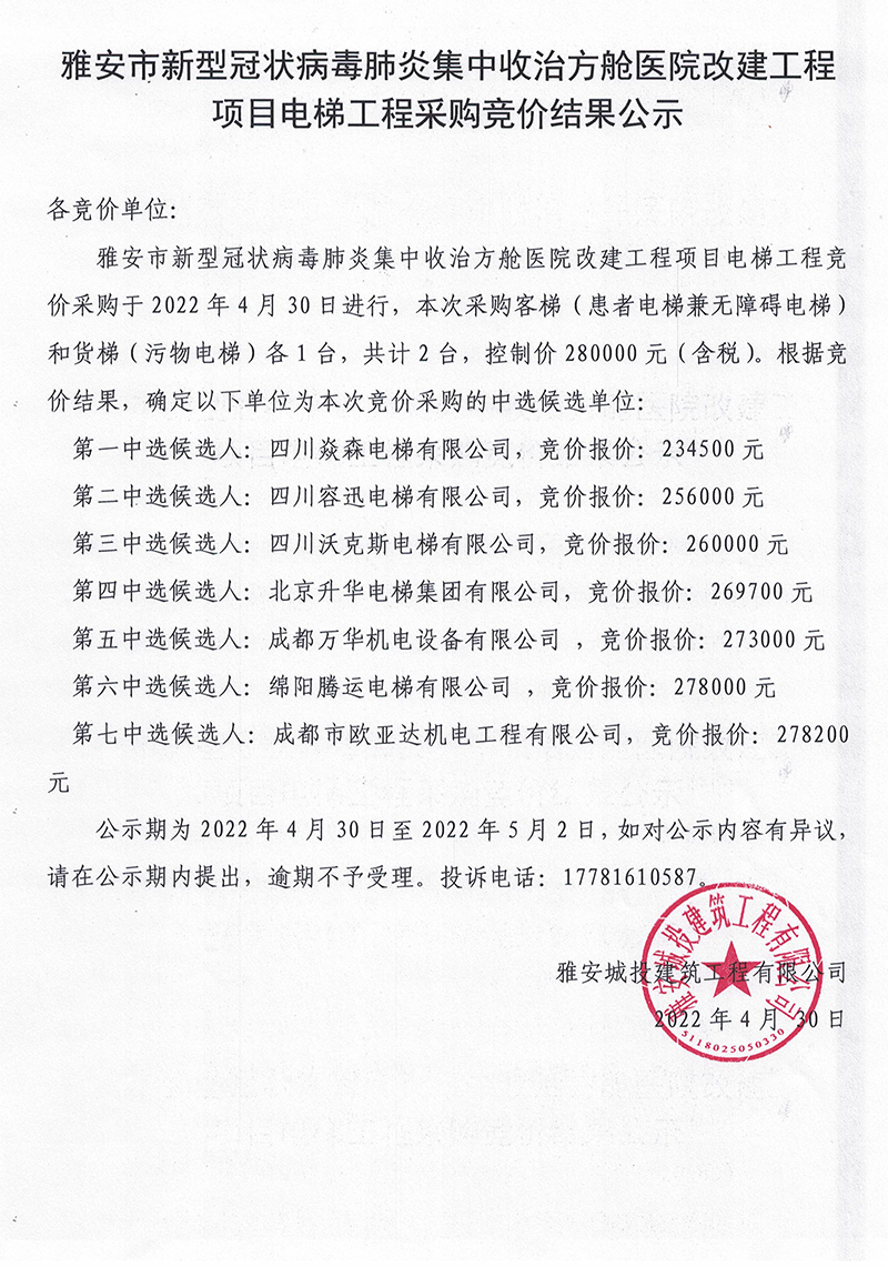 雅安市新型冠狀病毒肺炎集中收治方艙醫(yī)院改建工程項目電梯工程采購競價結(jié)果公示