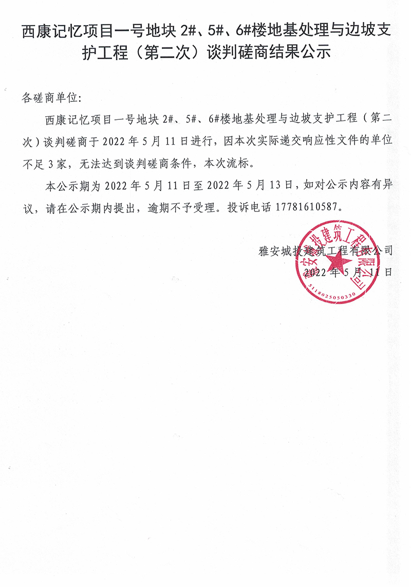 西康記憶項目一號地塊2#、5#、6#樓地基處理與邊坡支護工程(第二次)談判磋商結果公示