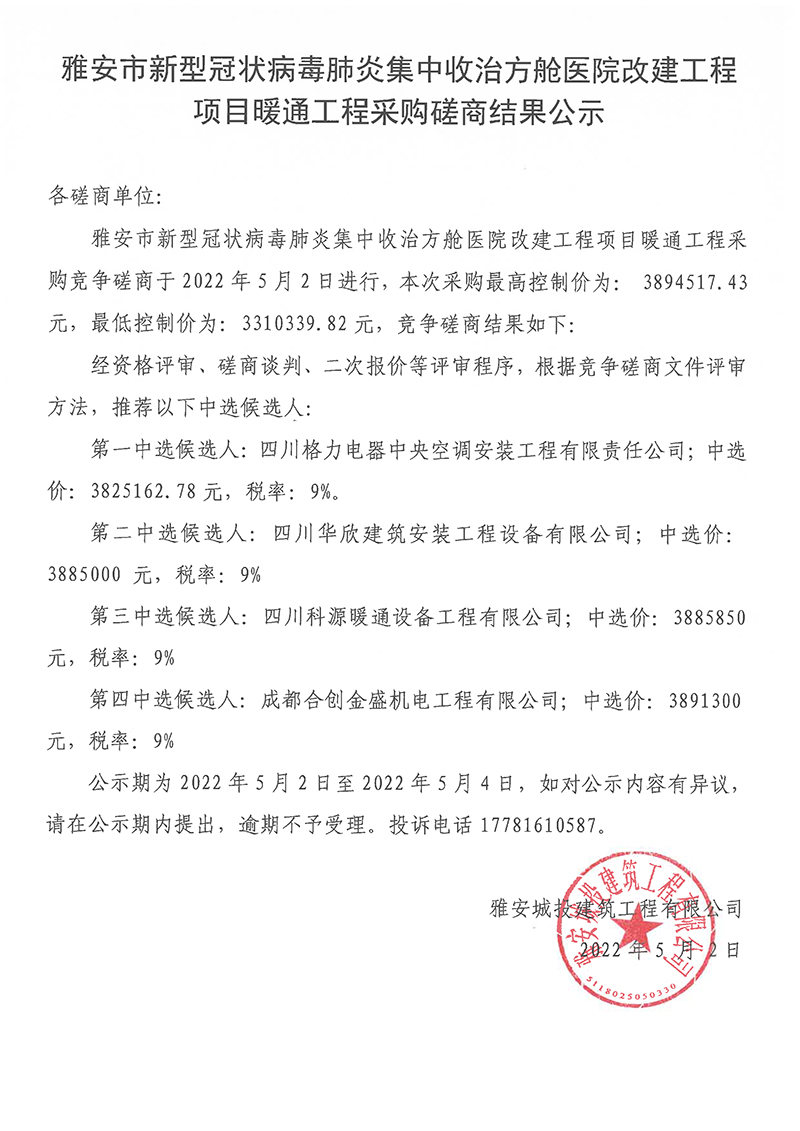 雅安市新型冠狀病毒肺炎集中收治方艙醫(yī)院改建工程項目暖通工程采購磋商結果公示
