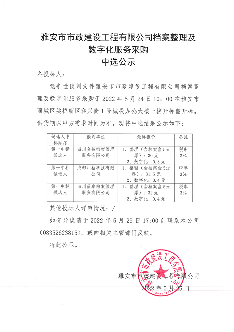 雅安市市政建設(shè)工程有限公司檔案整理及數(shù)字化服務(wù)采購(gòu)中選公示