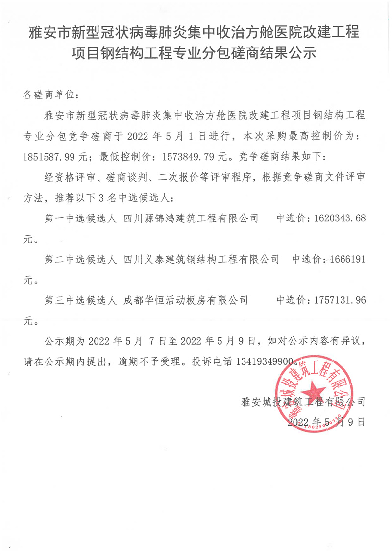 雅安市新型冠狀病毒肺炎集中收治方艙醫(yī)院改建工程項目鋼結構工程專業(yè)分包磋商結果公示