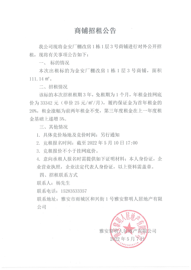 金安廠棚改房1棟1層3號商鋪招租公告