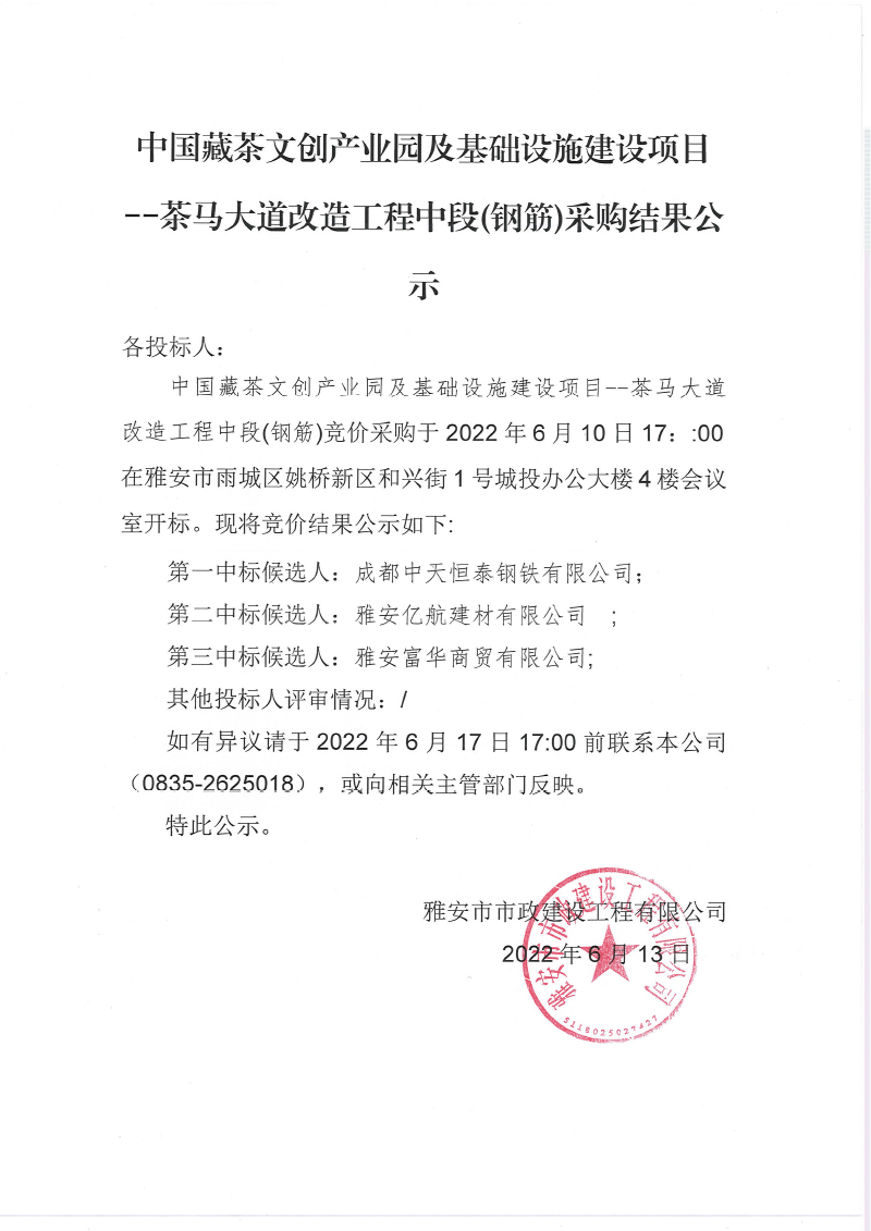 中國(guó)藏茶文創(chuàng)產(chǎn)業(yè)園及基礎(chǔ)設(shè)施建設(shè)項(xiàng) 茶馬大道改造工程中段鋼筋采購(gòu)結(jié)果公示