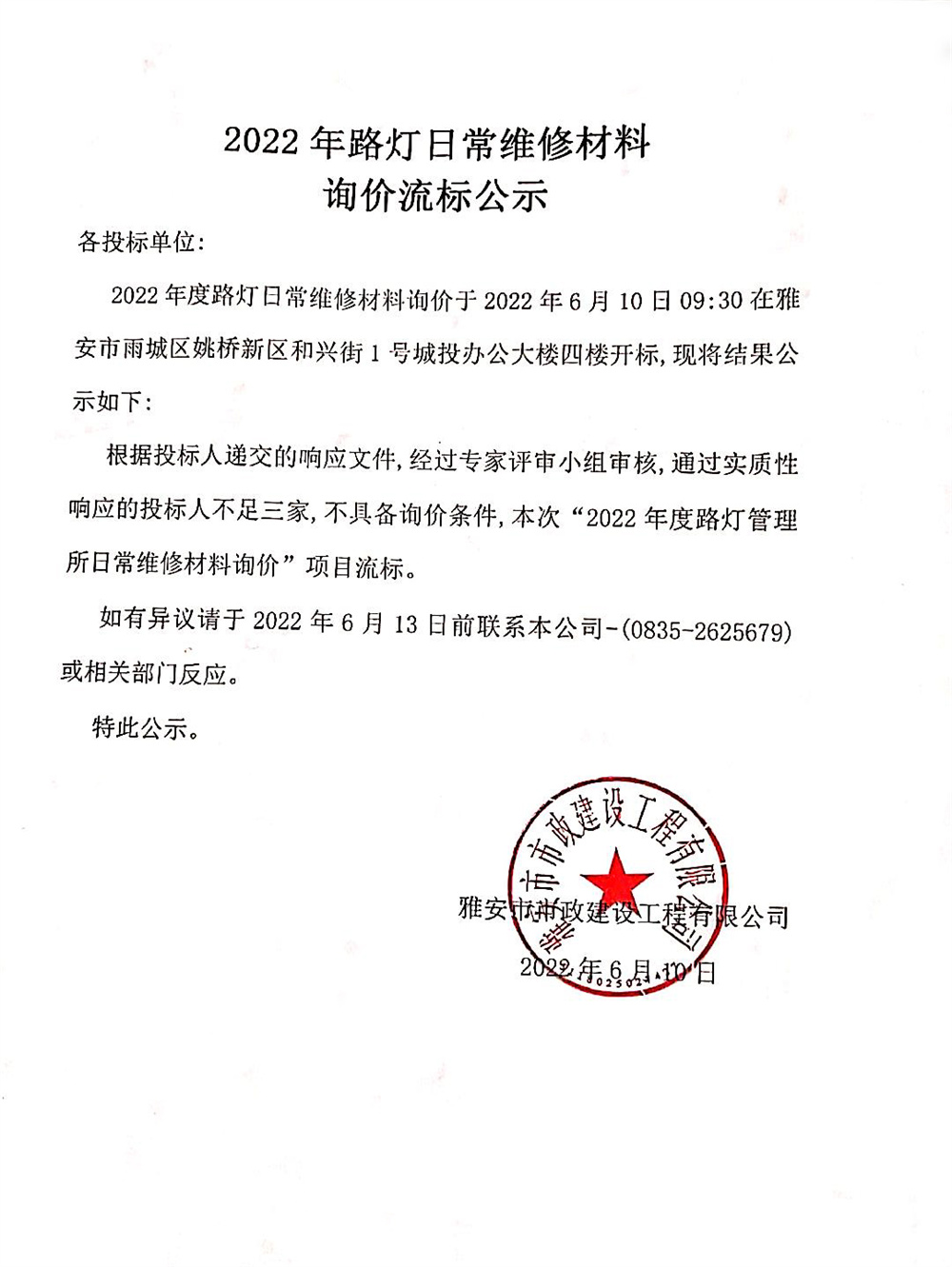2022年路燈日常維修材料詢(xún)價(jià)流標(biāo)公示