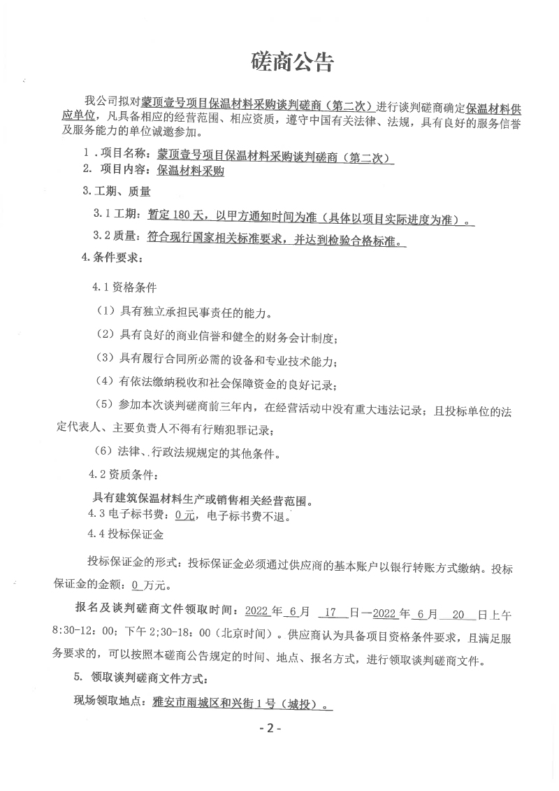 蒙頂壹號(hào)項(xiàng)目保溫材料采購(gòu)談判磋商(第二次)公告