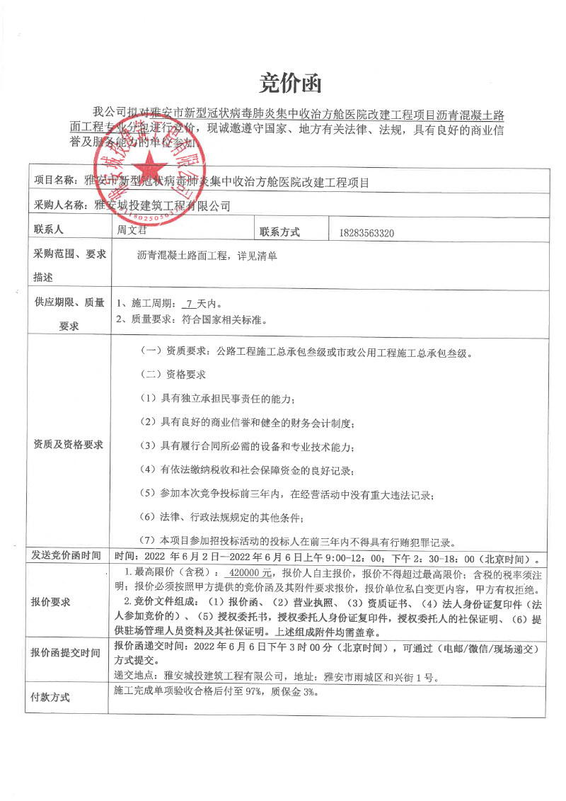 雅安市新型冠狀病毒肺炎集中收治方艙醫(yī)院改建工程項目瀝青混凝土路面工程專業(yè)分包競價函