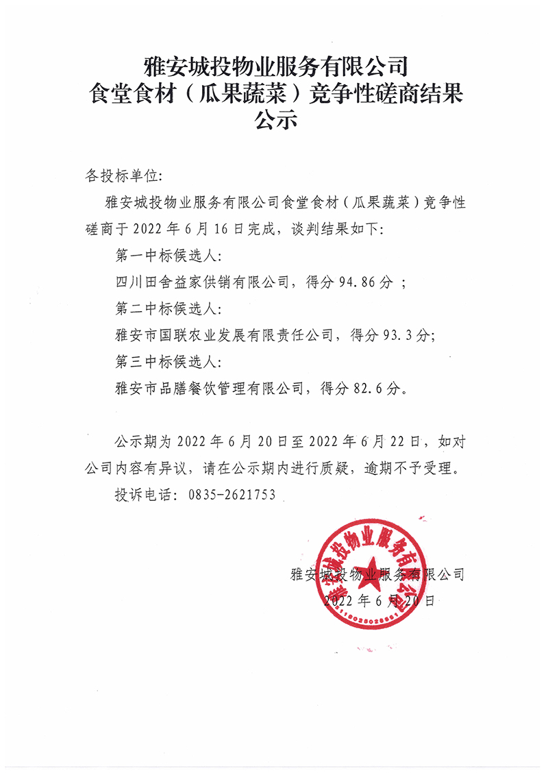 城投公司食堂食材(瓜果蔬菜)采購(gòu)項(xiàng)目談判磋商結(jié)果公示