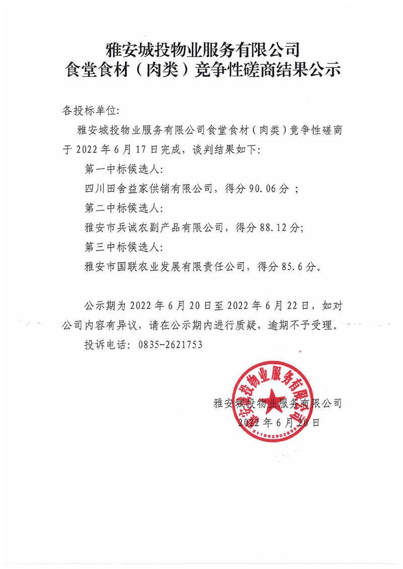 城投公司食堂食材(肉類)采購項目競爭性磋商結果公示