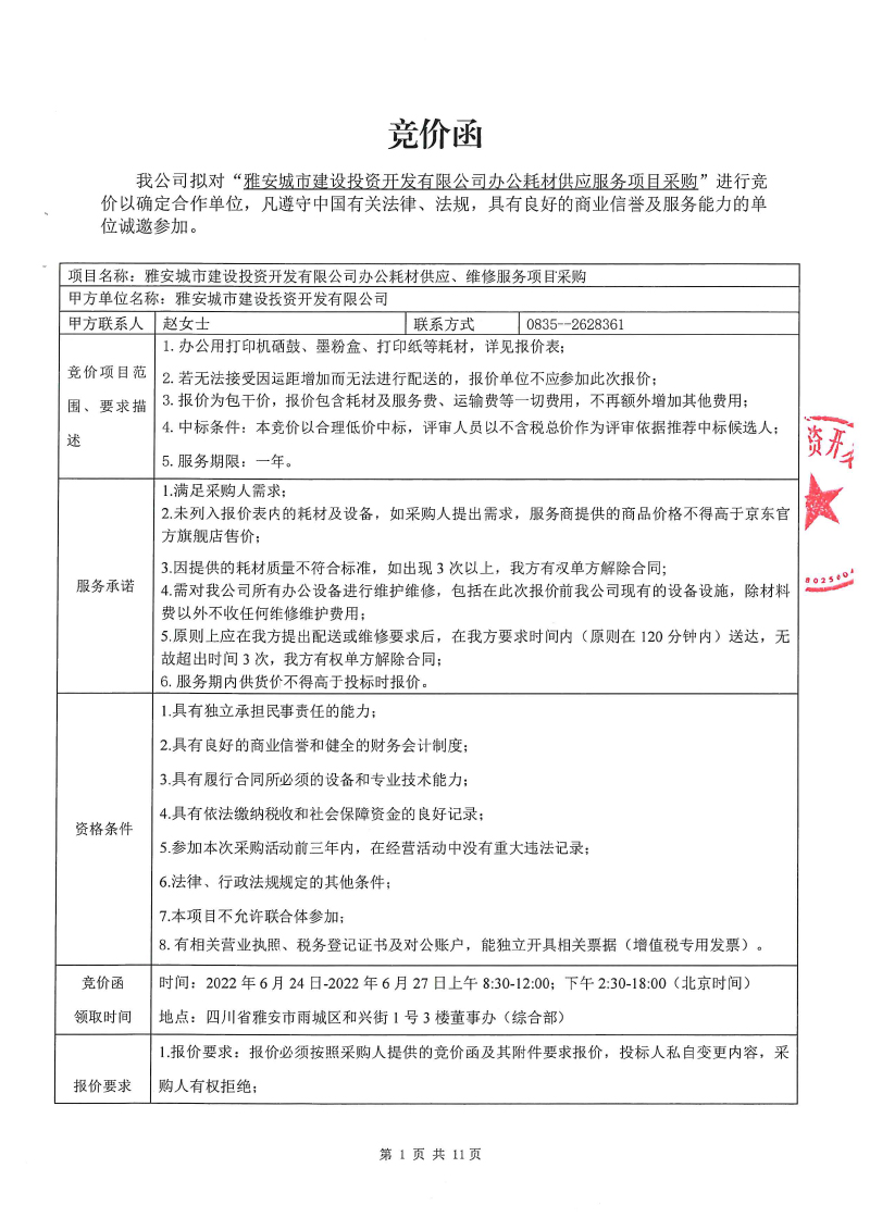 雅安城市建設(shè)投資開發(fā)有限公司 辦公耗材供應(yīng)、維修服務(wù)項(xiàng)目采購(gòu)競(jìng)價(jià)公告