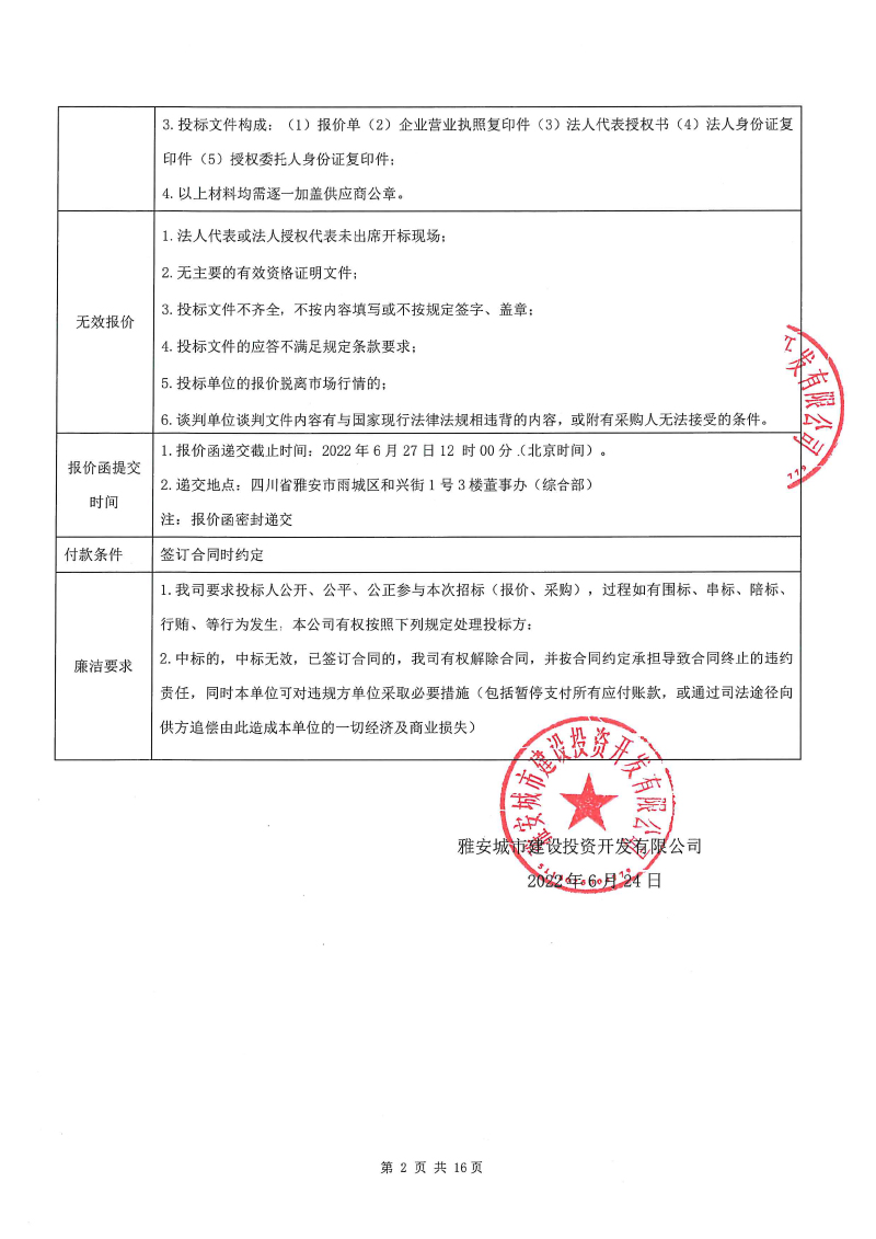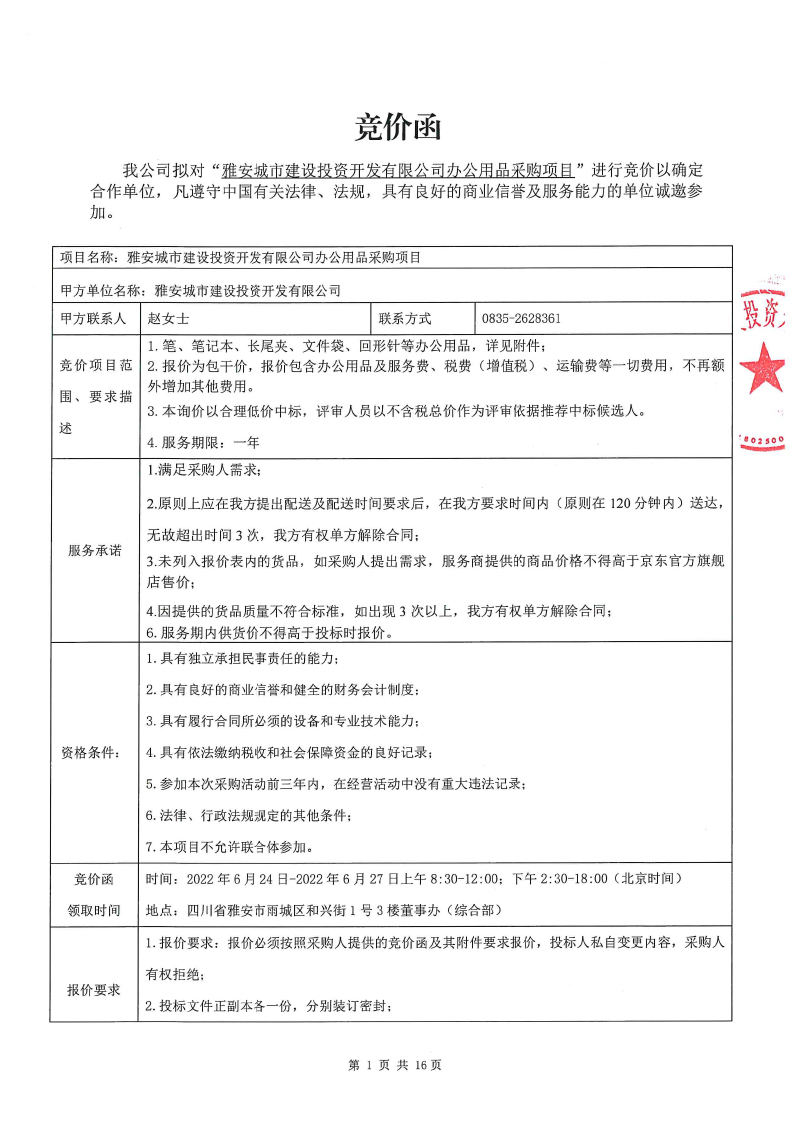 雅安城市建設投資開發(fā)有限公司辦公用品采購項目競價公告