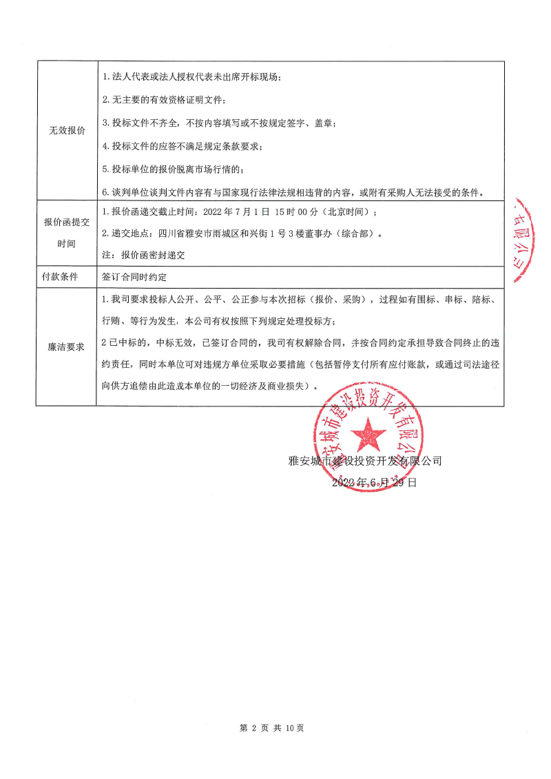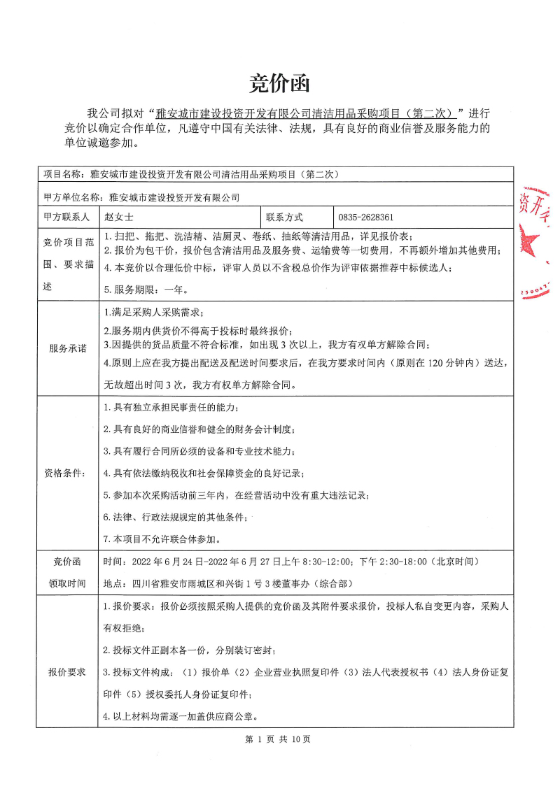 雅安城市建設投資開發(fā)有限公司 清潔用品采購項目(第二次)競價公告