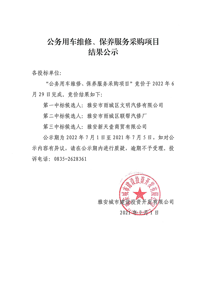 雅安城市建設(shè)投資開發(fā)有限公司 公務(wù)用車維修、保養(yǎng)服務(wù)采購(gòu)項(xiàng)目結(jié)果公示