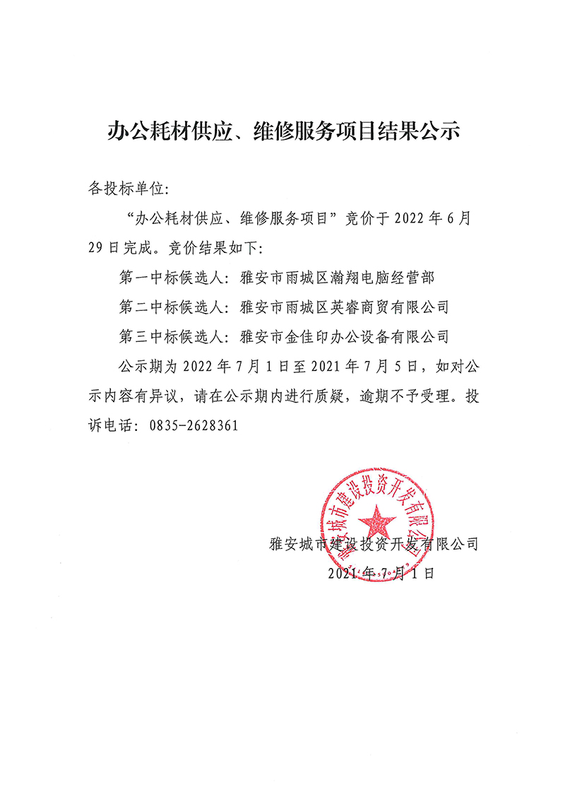 雅安城市建設投資開發(fā)有限公司 辦公耗材供應、維修服務項目采購競價結果公示