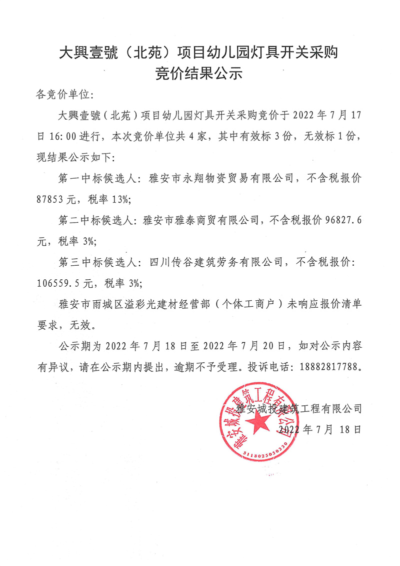 大興壹號(北苑)項目幼兒園燈具開關(guān)競價結(jié)果公示