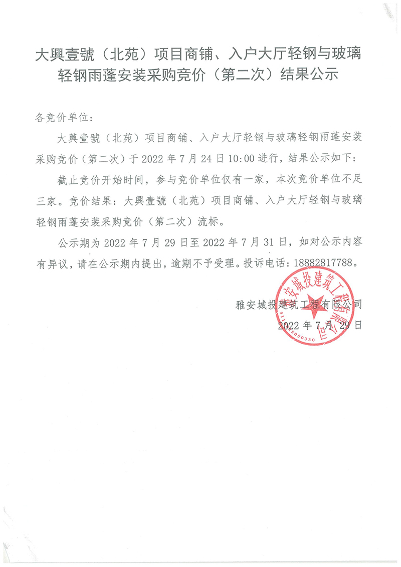 大興壹號(hào)(北苑)項(xiàng)目商鋪、入戶大廳輕鋼與玻璃輕鋼雨棚安裝采購(gòu)競(jìng)價(jià)(第二次)結(jié)果公示