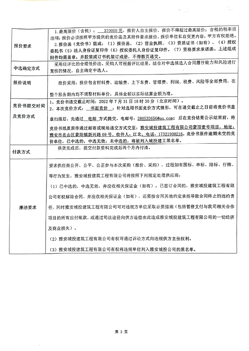 蒙頂壹號項目橋架采購(第二次)競價公告