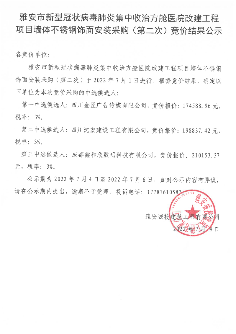 雅安市新型冠狀病毒肺炎集中收治方艙醫(yī)院改建工程項(xiàng)目墻體不銹鋼飾面安裝采購(第二次)競價(jià)結(jié)果公示