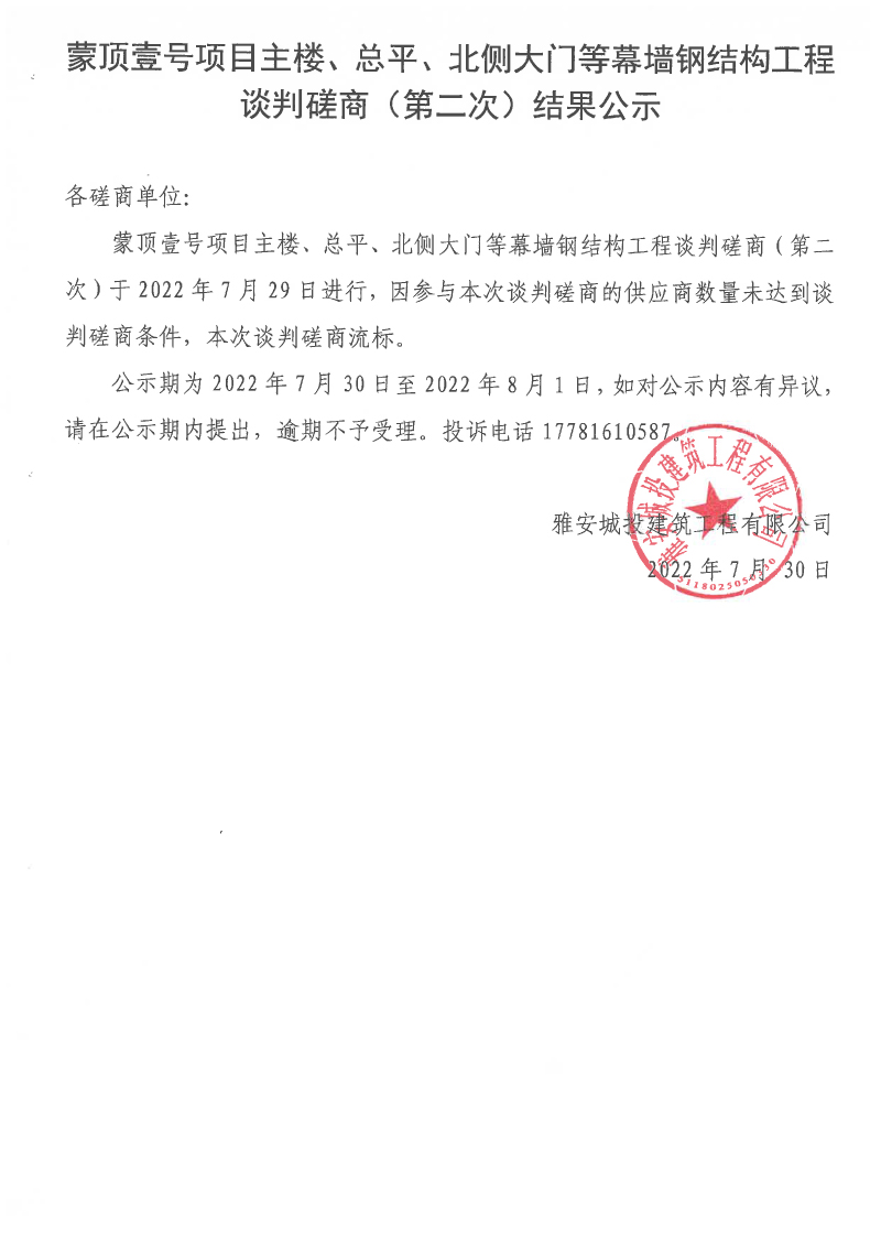 蒙頂壹號(hào)項(xiàng)目主樓、總坪、北側(cè)大門等幕墻鋼結(jié)構(gòu)工程談判磋商(第二次)結(jié)果公示