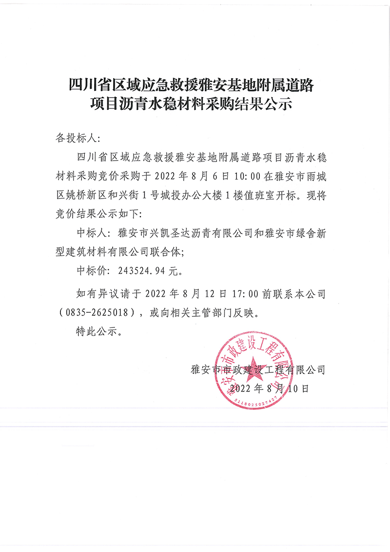 四川省區(qū)域應急救援雅安基地附屬道路項目瀝青水穩(wěn)材料采購結果公示