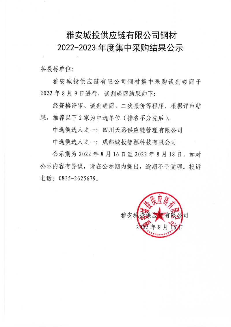 雅安城投供應(yīng)鏈有限公司鋼材2022-2023年度集中采購(gòu)結(jié)果公示