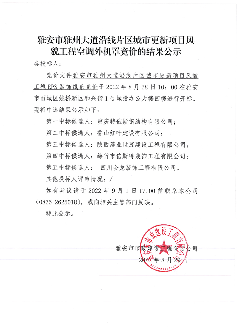雅安市雅州大道沿線片區(qū)城市更新項目風(fēng)貌工程空調(diào)外機罩競價的結(jié)果公示
