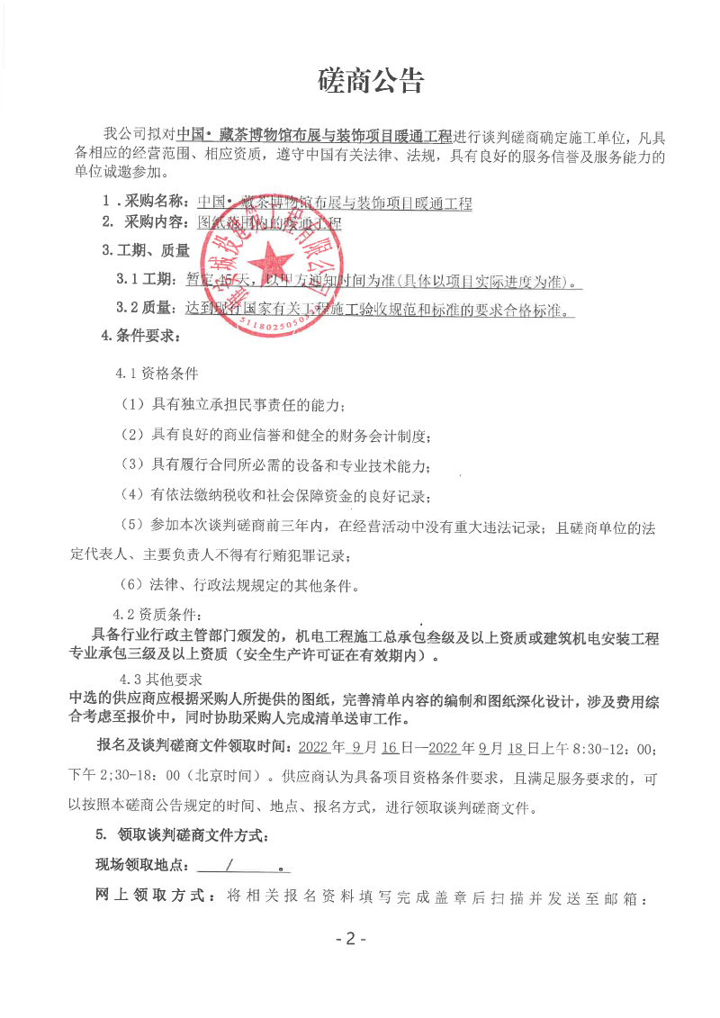 中國• 藏茶博物館布展與裝飾項(xiàng)目暖通工程談判磋商公告