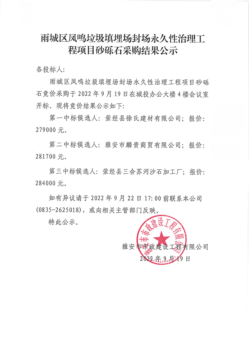 雨城區(qū)鳳鳴垃圾填埋場(chǎng)永久性封場(chǎng)治理工程項(xiàng)目砂礫石采購結(jié)果公示