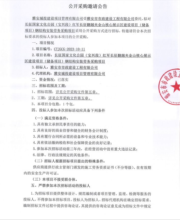 長征國家文化公園(寶興段)紅軍長征翻越夾金山核心展示區(qū)建設(shè)項(xiàng)目(儲備項(xiàng)目)鋼結(jié)構(gòu)安裝勞務(wù)采購項(xiàng)目公開采購邀請公告