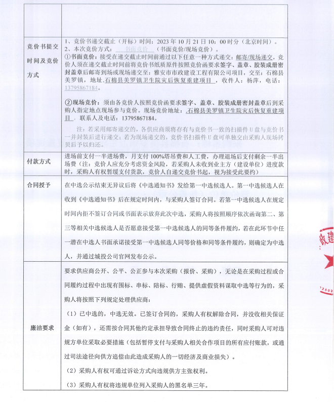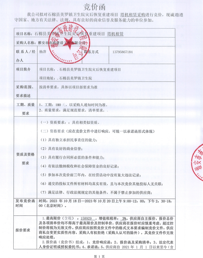 石棉縣美羅鎮(zhèn)衛(wèi)生院災(zāi)后恢復(fù)重建項(xiàng)目塔機(jī)租賃采購競價(jià)公告